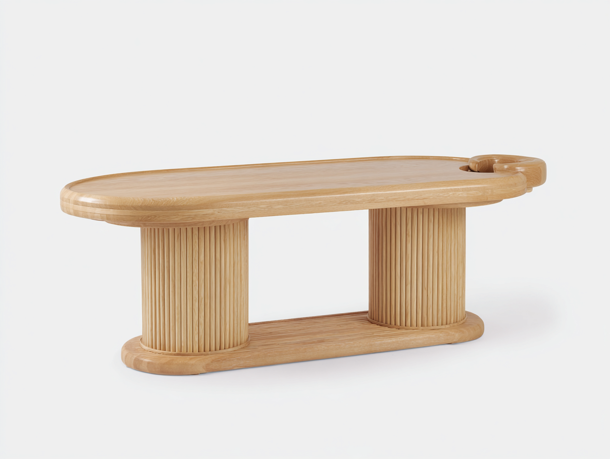La mesa está fabricada en madera de color natural que resalta la textura del material. El tablero presenta bordes suavemente redondeados que aportan una estética moderna y una superficie agradable al uso. La base está formada por columnas con detalles verticales que proporcionan estabilidad estructural y refuerzan el estilo decorativo del conjunto.